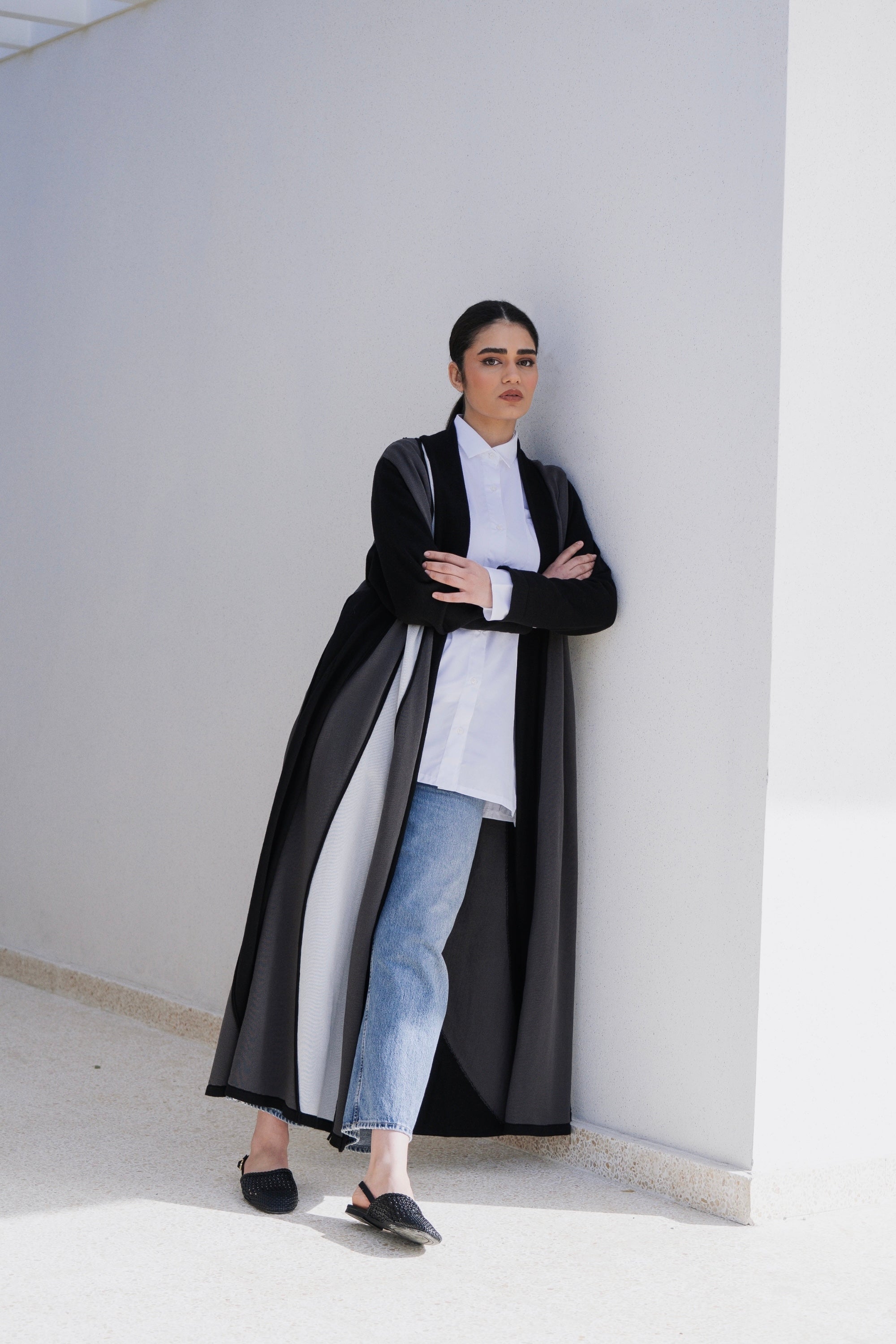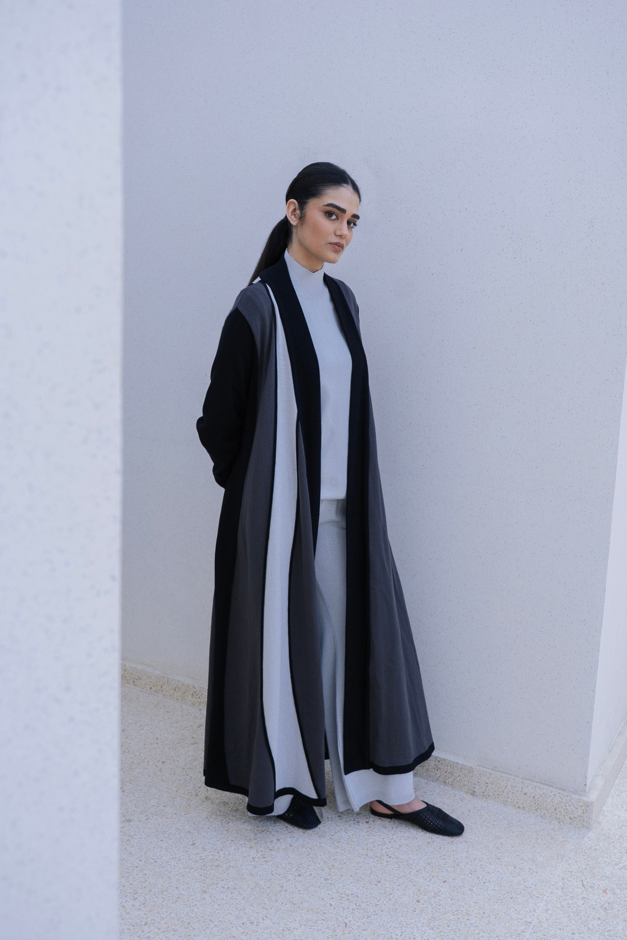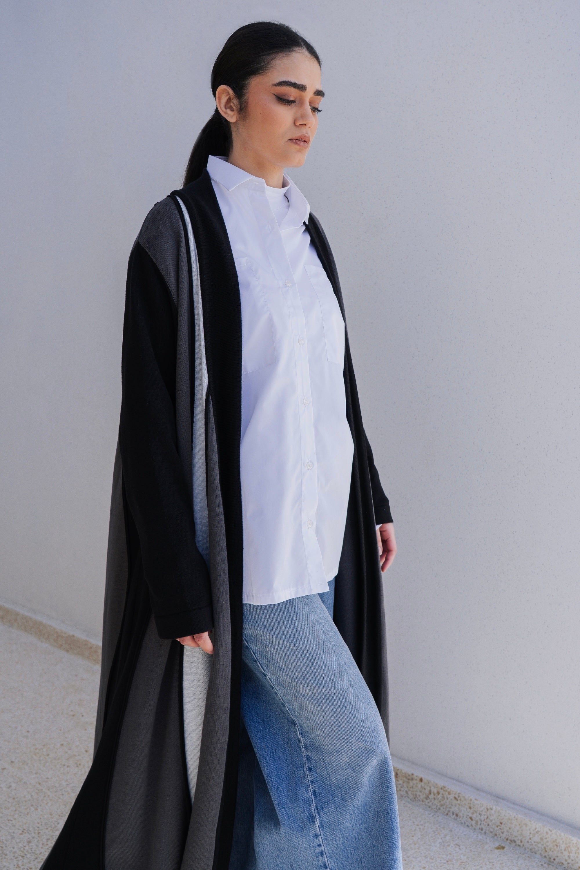 When the holy month of Ramadan comes in the middle of February, a warmer Abaya is needed. Introducing our Knit Abayas: made of soft cotton-blend knit that combines the warmth of cardigans with the flare of Abayas. The sleeves are carefully designed to be functional if you're not into extra wide sleeves. The length is perfect for adding boots, heels, or mules and to wear with cropped pants or even longer ones. Pair it with our knit t-shirts or flare pants in black, cloud or gunmetal.
