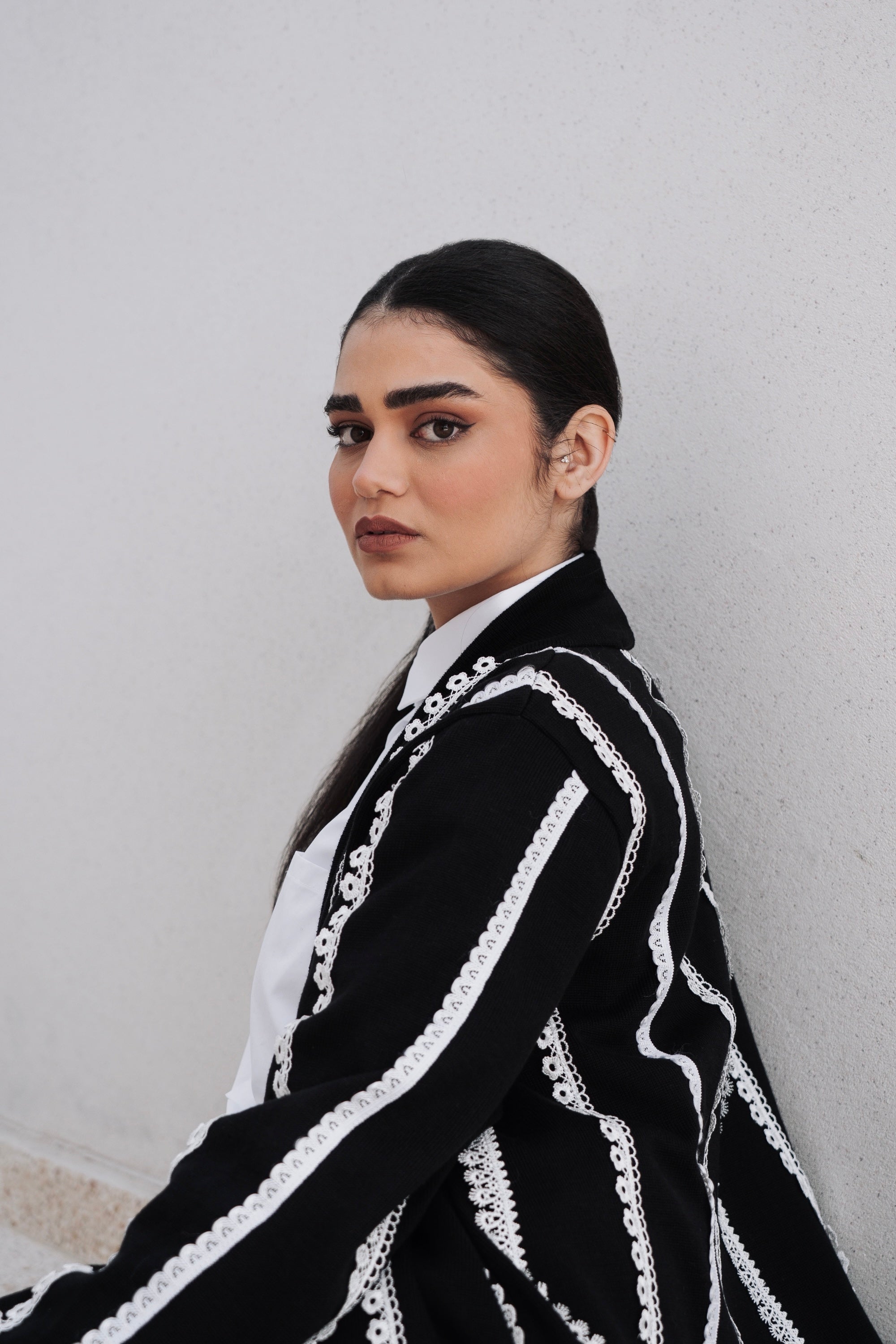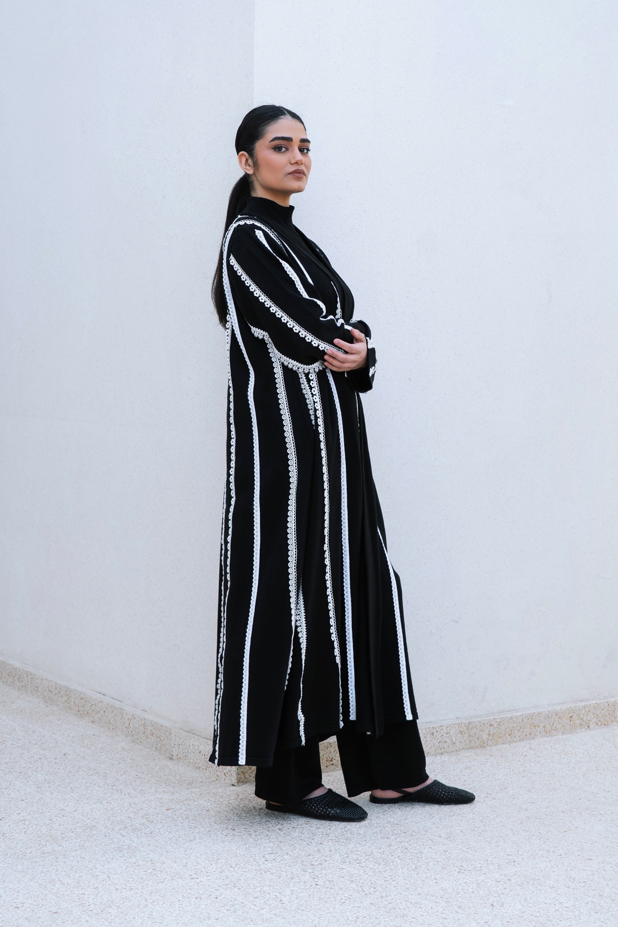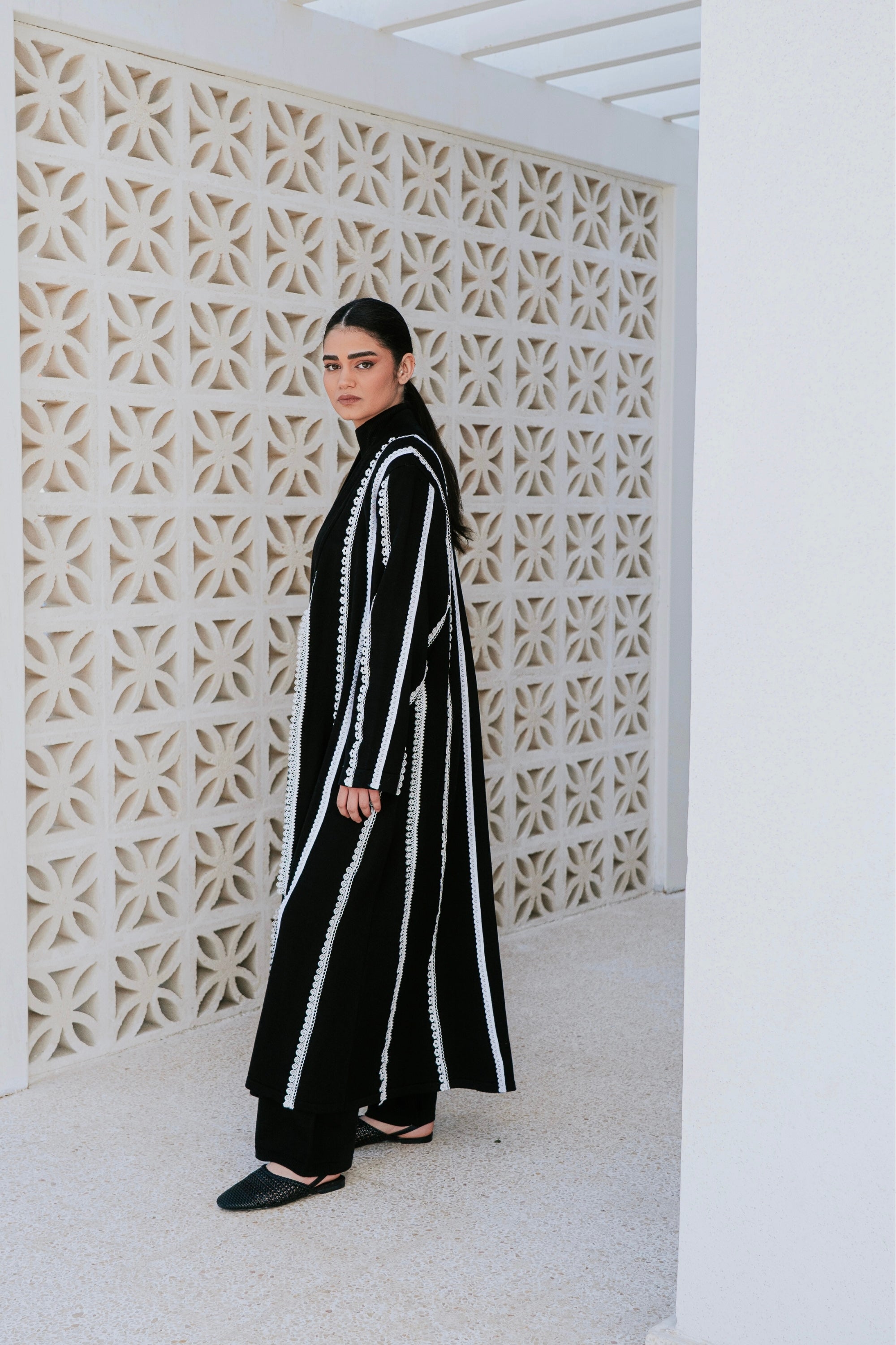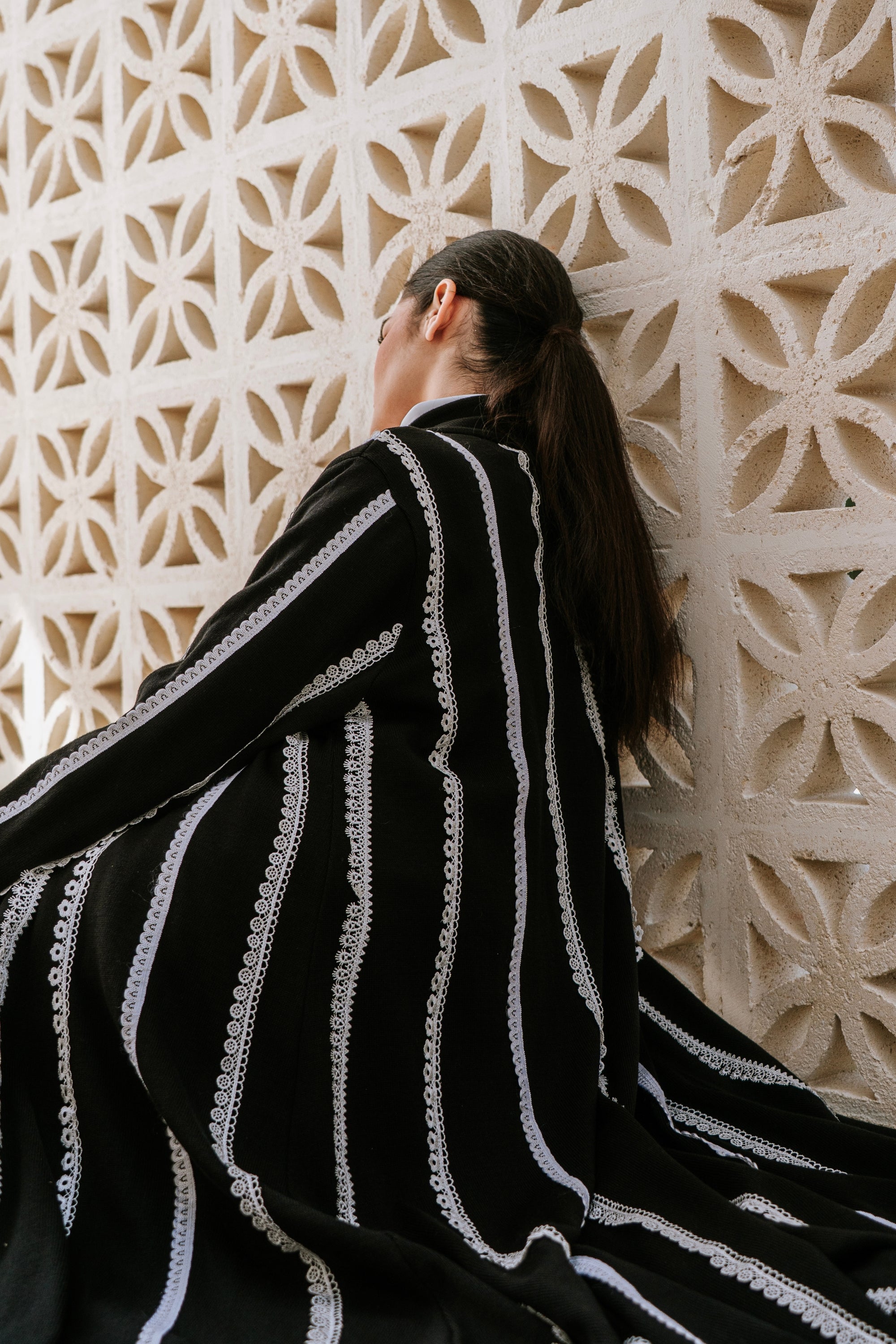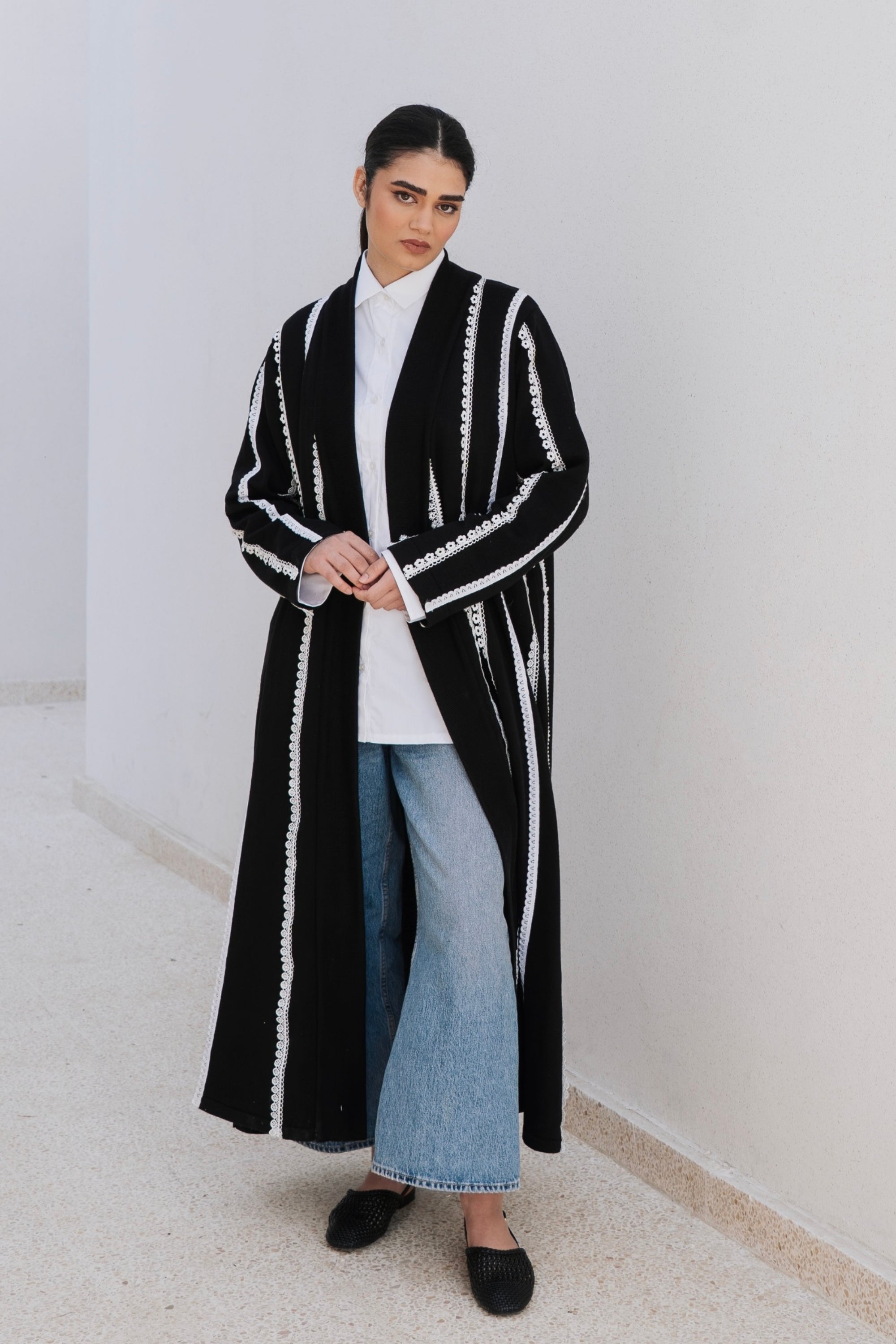 When the holy month of Ramadan comes in the middle of February, a warmer Abaya is needed. Introducing our Knit Abayas: made of soft cotton-blend knit that combines the warmth of cardigans with the flare of Abayas. The sleeves are carefully designed to be functional if you're not into extra wide sleeves. The length is perfect for adding boots, heels, or mules and to wear with cropped pants or even longer ones. This black version comes with delicate lace trims that create a truly unique look.